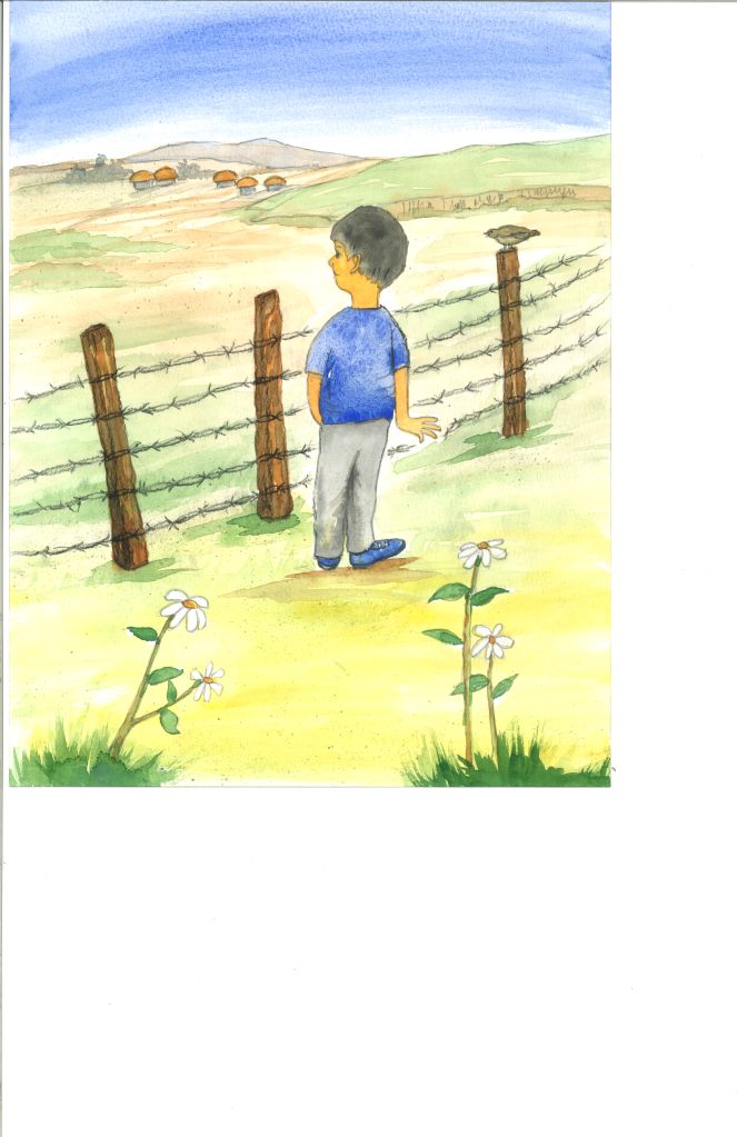 The Barbed Wire Fence by Joon-hi You look menacing. All I want to do is to find my uncle, but I cannot do that because of you. But it's not your fault, not your fault. --from the book Hal-Abeoji's Wish Joon-hi, the eight-year-old boy, wants to find his grand-uncle who is supposed to be living in North Korea, before his grandfather dies and he becomes an orphan. Can he find him? ©Byung A. Fallgren